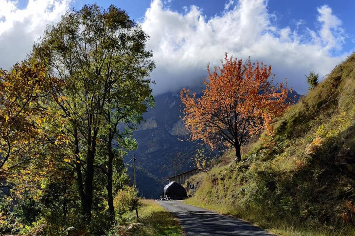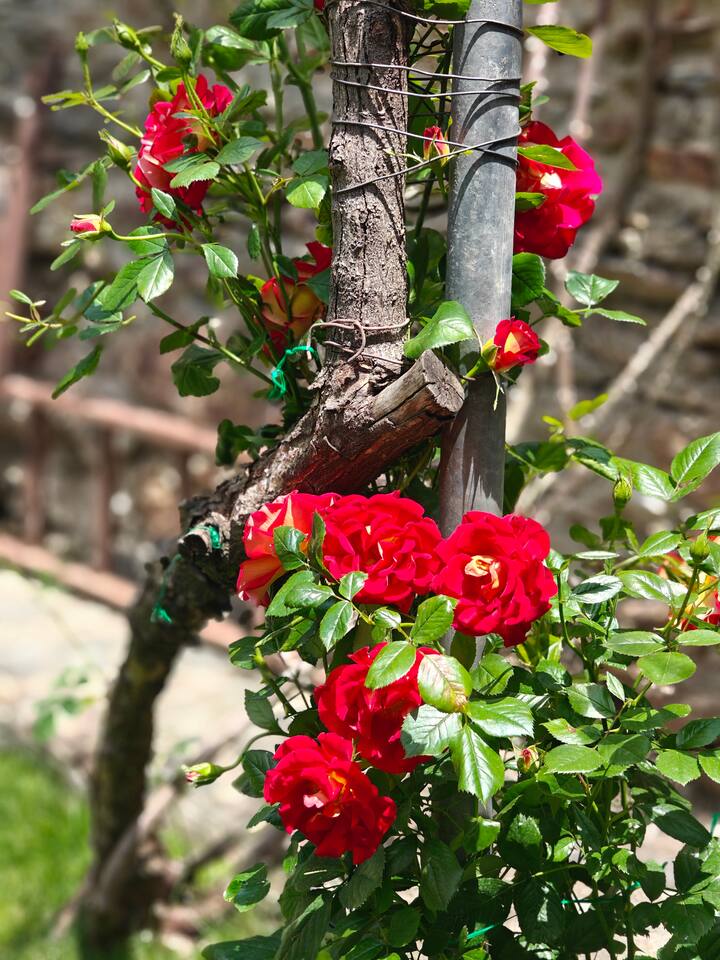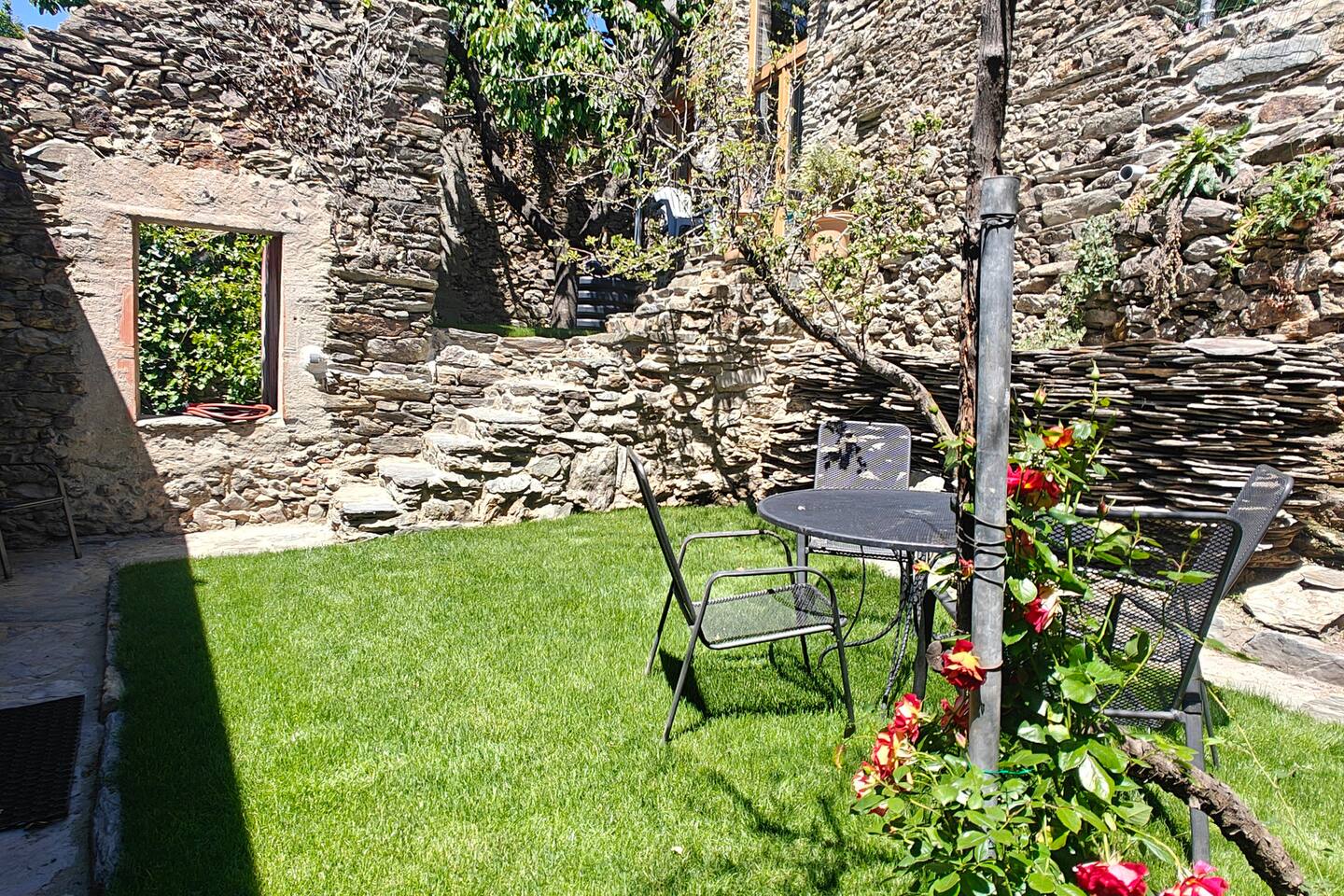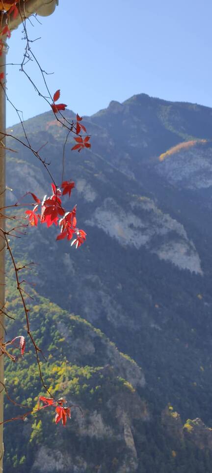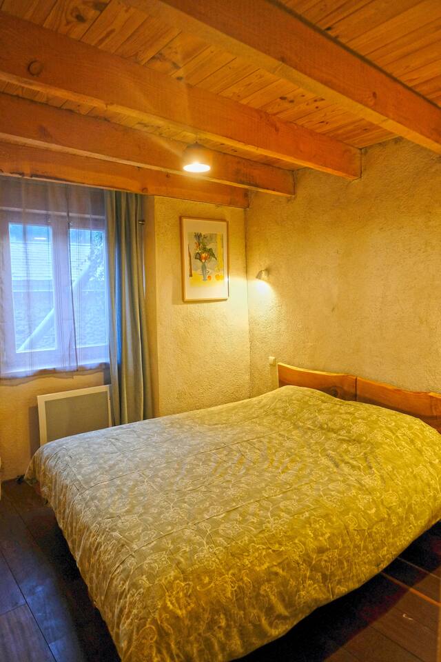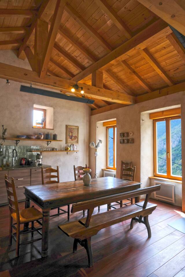 Comfortable mountain village house with small private inner court behind the house. (next to the house is the footpath going down to the village square) Upper floor: Sitting area with large dining table and open kitchen; Lower floor: Master bedroom with double bed; Second bedroom with (at choice) two single beds or one double bed; bathroom with a Italian style rainshower